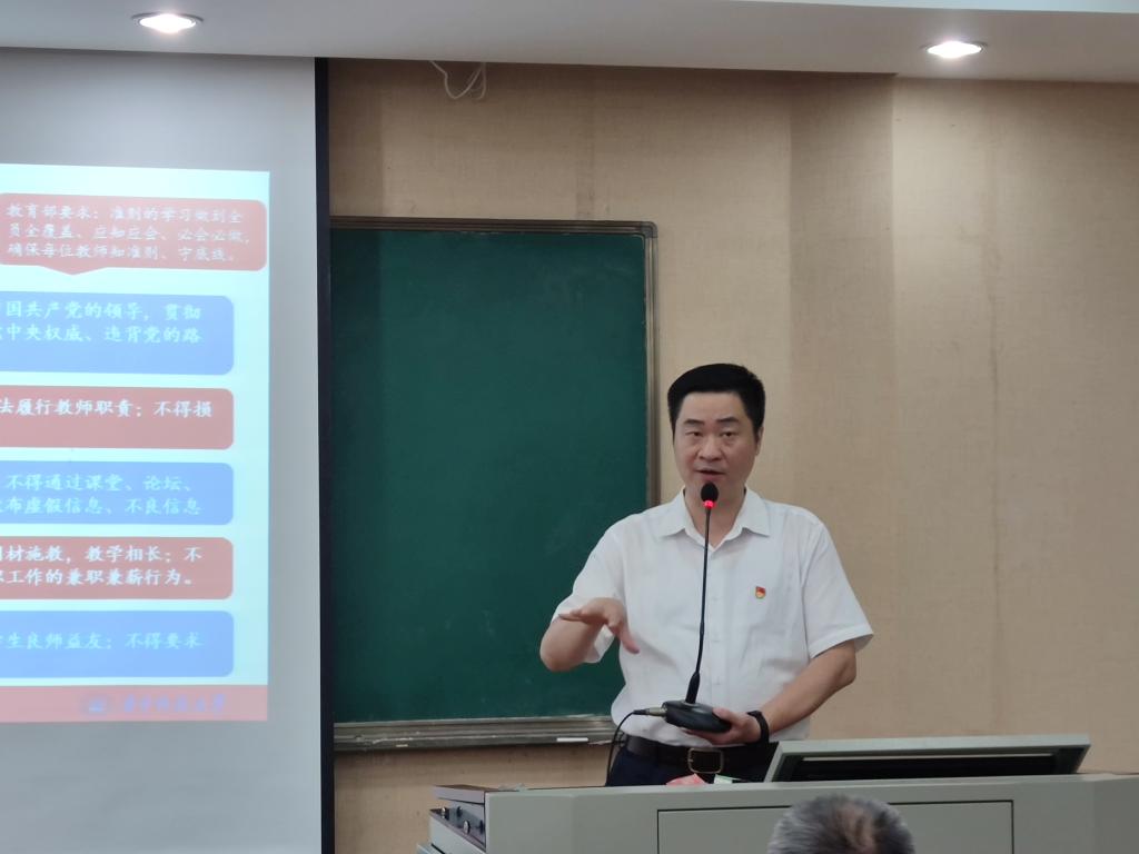 研究生导师管理办法》《教育部关于高校教师师德失范行为处理的指导意见》等文件进行逐条解读。他列举了近五年学校和学院优秀教职工典型,通报了教育部公开曝光的违反高校教师职业行为十项准则典型案例,并深刻分析了“典型案例”出现的原因及警示意义。会上,与会教师围绕师德师风建设工作进行了充分讨论。