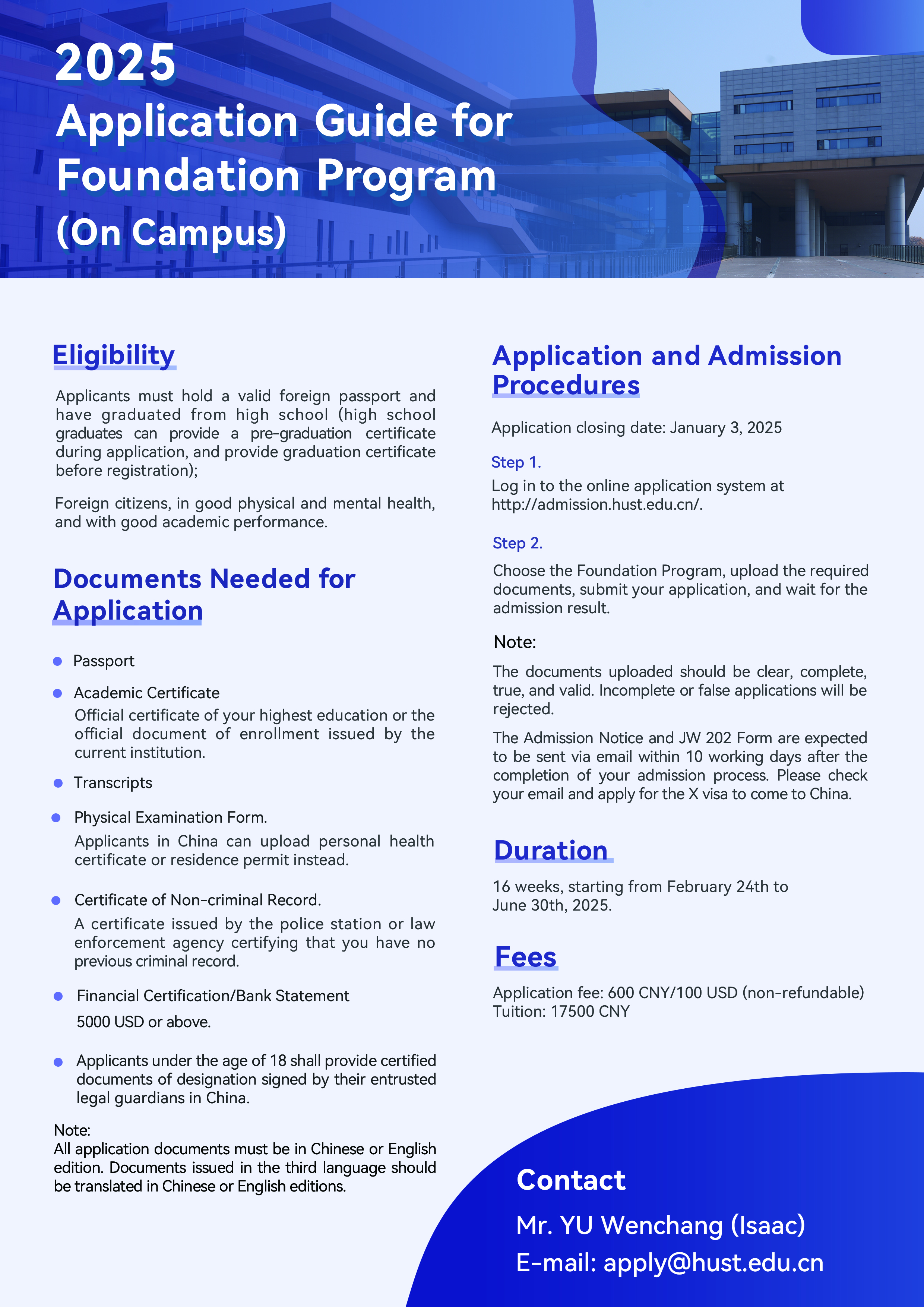 Applicants must hold a valid foreign passport and have graduated from high school (high school graduates can provide a pre-graduation certificate during application, and provide graduation certificate before registration);
