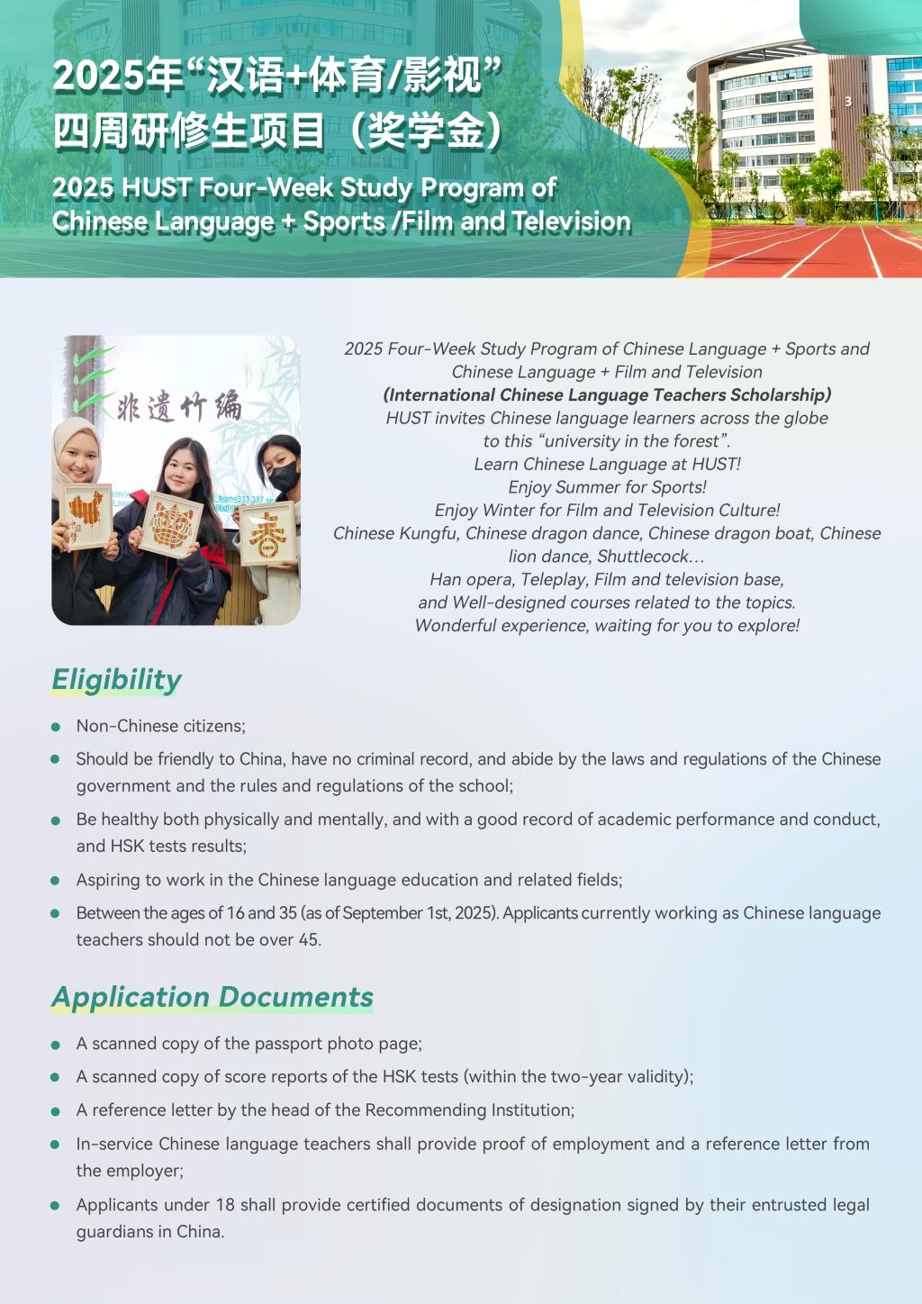 2025 Application Guide for Four-Week Study Program of Chinese Language + Sports and Chinese Language + Film and Television at HUST(Scholarship)