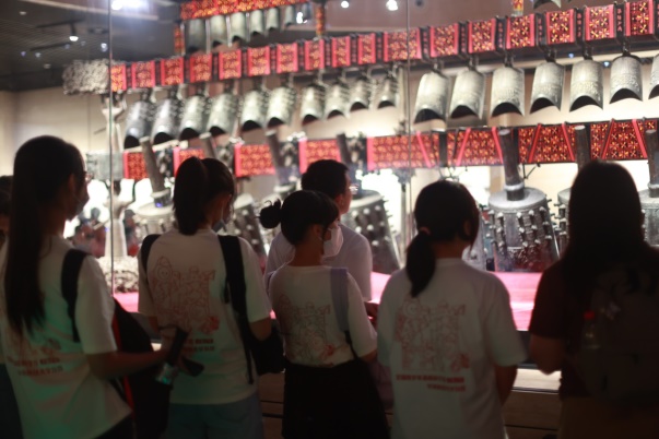 7月24日下午,来自台湾的营员们、带队教师及志愿者走进了湖北省博物馆,一同感受荆楚大地的文化魅力。营员们踏入曾侯乙墓展厅和梁庄王展厅。曾侯乙编钟与曾侯乙尊盘等这些藏品呈现出高度繁荣的礼乐文明,展现了中国古代青铜铸造、天文历法、音乐艺术等领域的卓越成就,让营员们从多维度认识了荆楚文化;梁庄王展厅的礼仪服饰的金锭、金镶无色蓝宝石帽顶及金凤簪则带给营员们别样的体验。别具一格的文物,厚重的荆楚文化,深深地吸引着和感染着营员们。在荆楚文化渊薮的殿堂中,营员们欣赏着别具一格的文物,体悟着历史的厚重,也描绘着未来的绚丽!看到文物时的好奇与欣喜神色,聆听讲解过程中的期待与认真模样,无一不彰显着营员们对于荆楚文化的敬畏与热爱,此次在湖北省博物馆的参观,虽是告别之行,却也为他们的华中大之旅添上了浓墨重彩的一笔,勾勒出美好的回忆。