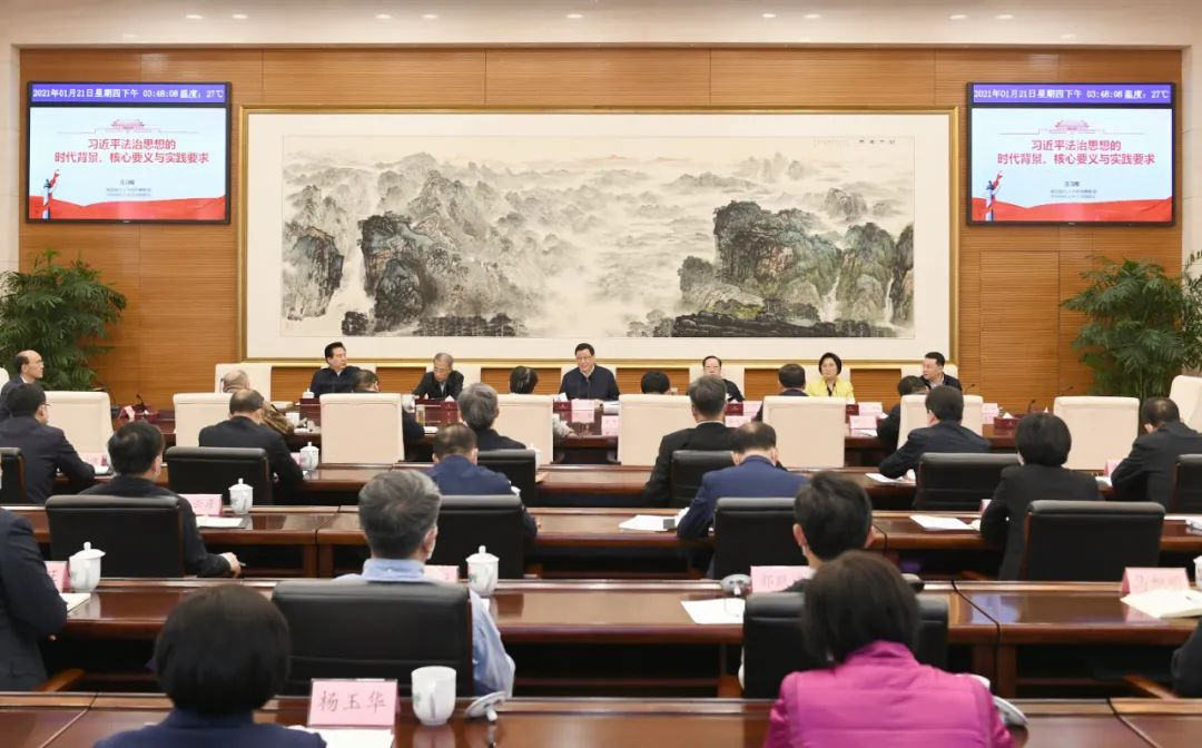 法学院院长汪习根受邀作了以《习近平法治思想的时代背景、核心要义与实践要求》为题的专题辅导报告。省委书记应勇主持会议,并指出,要深入学习宣传贯彻习近平法治思想,增强贯彻落实的思想自觉、政治自觉、行动自觉,牢牢把握推进法治建设的重点工作、重点任务,在法治轨道上推进省域治理现代化,建设更高水平的平安湖北、法治湖北。