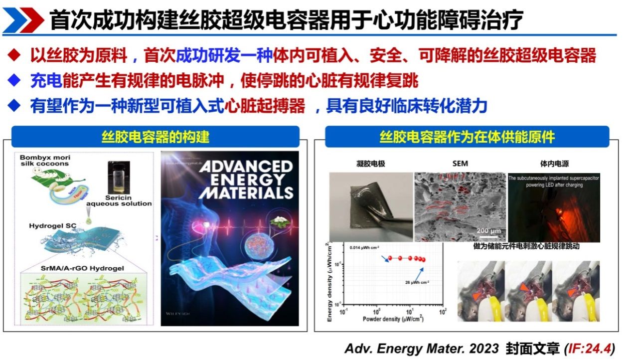 (1)目前临床使用的心脏起搏器通常是金属外壳结合锂电源等,毒性大、生物相容性差,并难以降解。王琳教授团队利用医工交叉研究的优势,以来自蚕丝中的丝胶为原料,首次设计并研发了一种可体内植入、安全、可吸收的丝胶超级电容器,该电容器具有很高的生物相容性和保形性能,移植到体内、充电后可以产生有规律的电脉冲,使得停跳的心脏有规律地复跳,因此有望作为一种植入式心脏起搏器的核心元件应用于临床,并具有良好临床转化前景。成果以封面文章发表于权威期刊Adv. Energy Mater.,并申请国家发明专利。