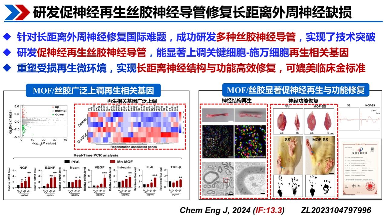 (3)针对长距离外周神经修复难的问题,王琳教授团队历时多年,研发了多种丝胶神经导管,实现了外周神经修复技术的突破。本年度成功研发一种促神经再生的丝胶神经导管,能通过广泛上调神经修复关键细胞-施万细胞再生相关基因的表达,有效重塑受损再生微环境,实现了长距离离断神经的结构及功能的高效修复,效果可媲美临床治疗的金标准。