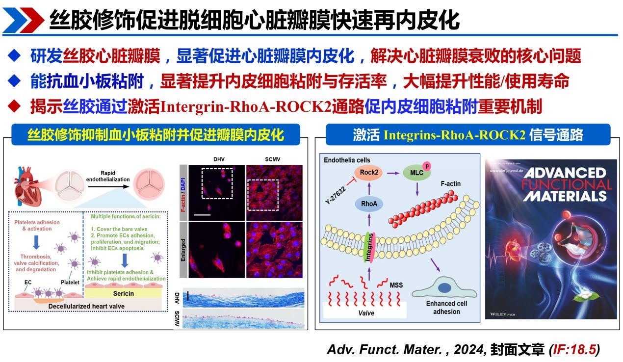 (2)针对目前临床使用的脱细胞心脏瓣膜易衰败,细胞化效率低下的问题,王琳教授带领团队率先研发了基于丝胶的心脏瓣膜,丝胶修饰显著促进了心脏瓣膜的内皮化,解决了心脏瓣膜生物瓣易衰败的核心问题,显著提高了其使用寿命及性能;并进一步研究揭示了丝胶促内皮细胞粘附的关键机制,成果以封面文章发表于国际权威期刊Adv. Funct. Mater,并获得国际高度评价。