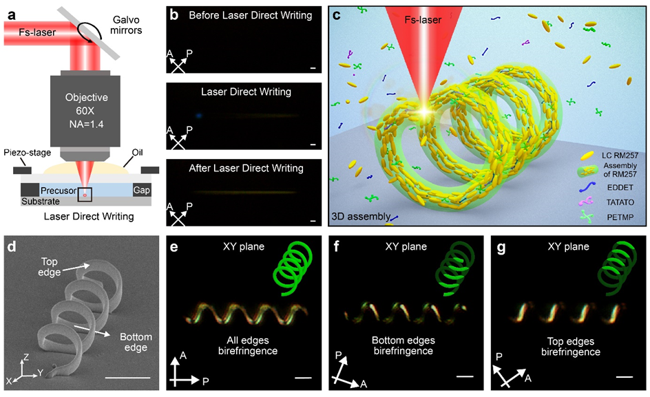熊伟研究团队基于飞秒激光定向组装分子的策略,利用飞秒激光直写的高精度和真三维制造优势,成功实现了液晶分子的亚微米精度(129.6 nm)和高自由度的三维组装,同时该方法在其他有机高分子材料的各向异性组装中也展现出了巨大的潜力。