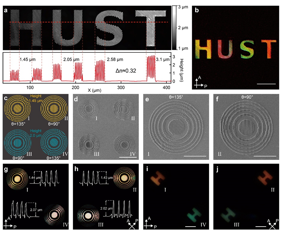 图3. 偏振干涉色与具有偏振选择和彩色成像功能的菲涅尔波带片阵列