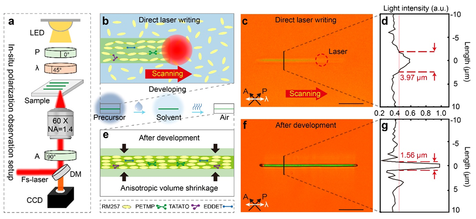 通过在加工系统上搭建实时偏振观察模块并结合理论推导计算,研究团队深入探讨了飞秒激光定向组装液晶分子的物理机制。研究表明,在飞秒激光扫描成形过程中会产生显著的激光诱导剪切力效应,液晶分子沿激光扫描方向形成取向种子层。在随后的显影过程中,由于各向异性的体积收缩,聚合物主链沿激光扫描路径定向排列,从而进一步强化规范了液晶分子的定向排布,如图2所示。