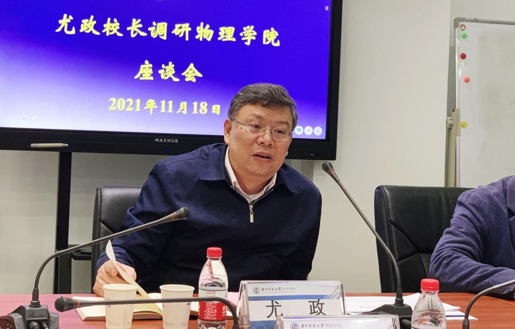 尤政对物理学院建院不到40年所取得的成绩给予充分肯定。他指出,精密重力测量国家重大科技基础设施、国家脉冲强磁场科学中心、武汉光电国家研究中心,这三大国家级科研平台为物理学科的发展奠定了坚实的基础。物理学院要继续发扬优势,坚持立德树人根本任务,将人才培养放在首位,将知识传授与思政实践深度融合;要凝心聚力,强化顶天立地的发展目标,充分利用大平台优势,产出世界级的创新成果;要重视队伍建设,坚持正确的评价考核机制,面向世界科技前沿和国家重大需求,全方位培养、引进、用好人才。