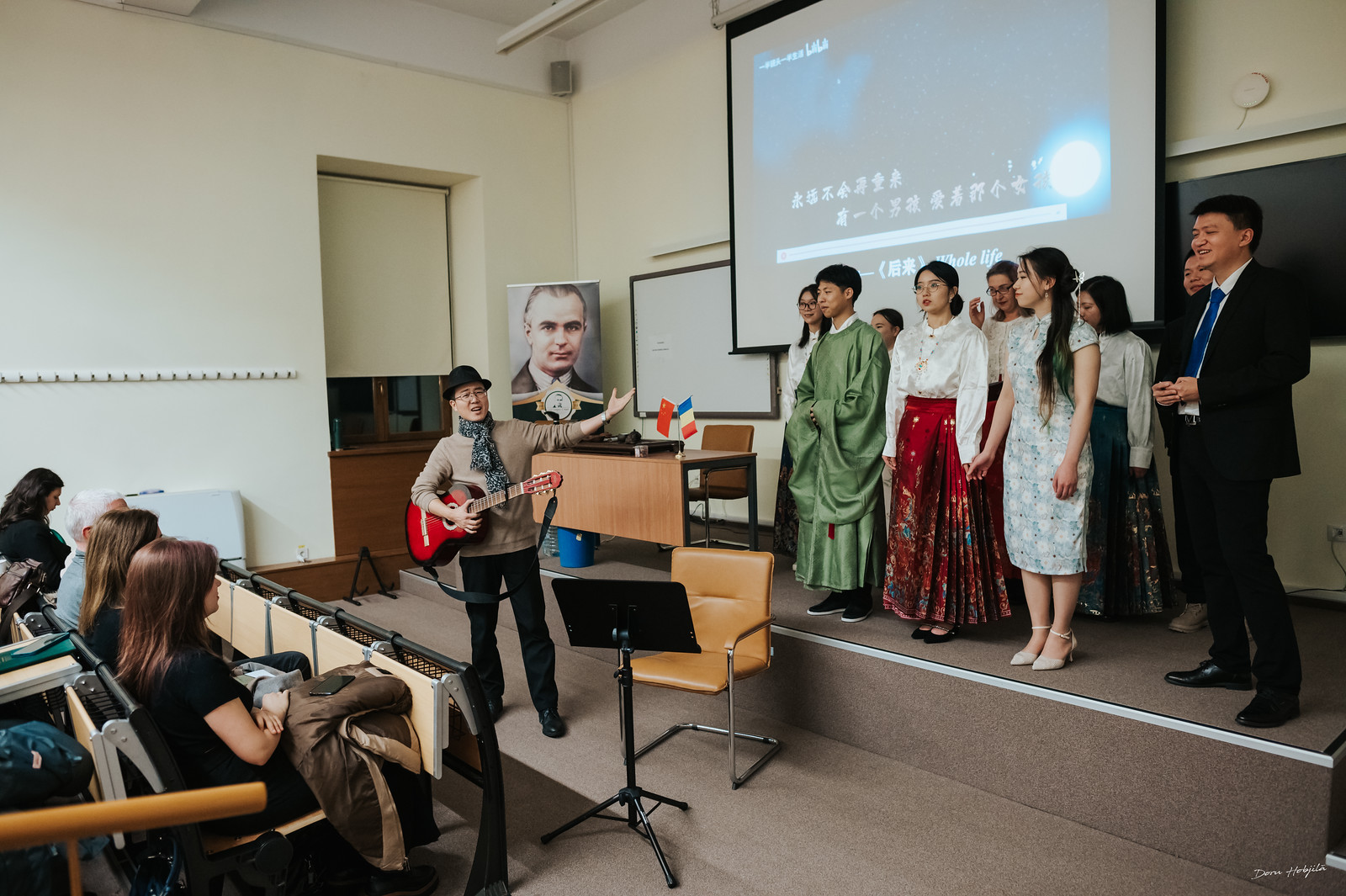 汉服翩跹,风华绝代。本次活动以国风为主题,全体孔院教师及志愿者们身着款式丰富、华美精致的汉服旗袍,穿梭于现场。舞台上,他们大放异彩:全体教师和志愿者一起合唱歌曲《后来》,中方院长陈攻亲自吉他伴奏;汉语志愿者教师赵颖身着汉服,一首琵琶独奏,音韵清幽,弦韵悠扬。本次活动还特别设置了观众互动环节,20几个关于中欧知识的抢答题吸引着大家积极参与,精美好礼轮番送出。传统小吃、品茶鉴茶同步举行,参与者们对新鲜泡制的多种香茗和口味丰富的茶点赞不绝口,雅医大孔院精心制作的茶文化手册也深化了大家对茶的认知。中欧青年师生们及当地民众相聚一堂,沉浸在中国文化氛围中,茶香在杯盏中逐渐晕开,散发出沁人心脾的清香。