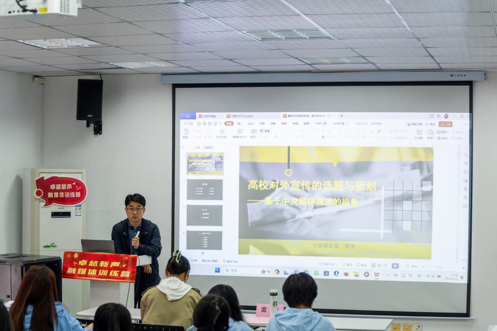 第五届“卓越新声”融媒体训练营专题讲座于大学生活动中心B303顺利开展。讲座特邀中国青年报湖北记者站站长雷宇围绕“高校对外宣传的选题与策划——基于中央媒体需求的视角”主题进行授课,为校园新闻报道打开了新思路。